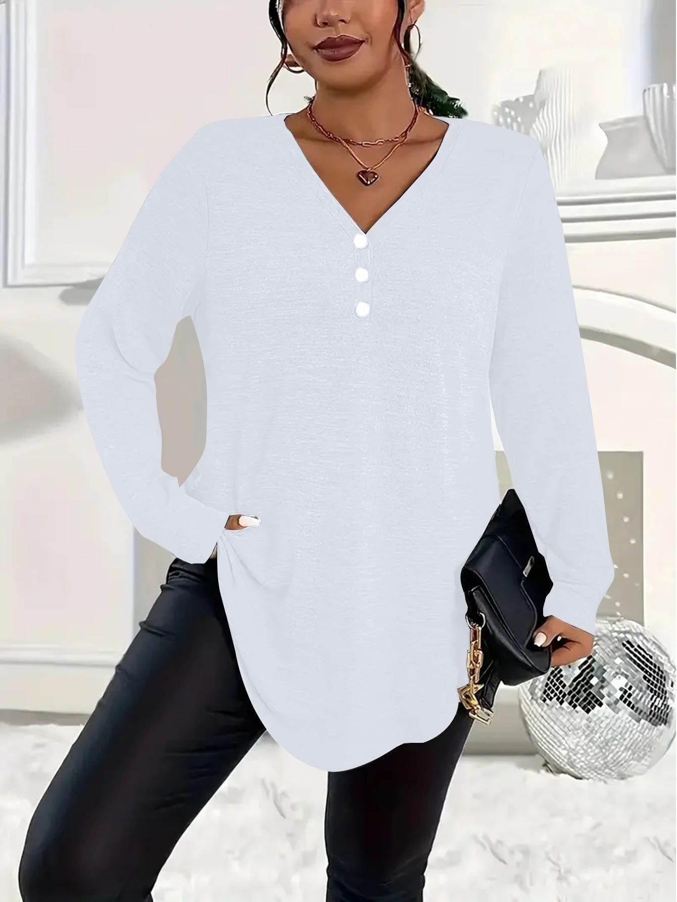 CHIC V-NECK DESIGN: The V-neck adds a touch of elegance, framing your neckline beautifully and complementing various accessories or layered looks effortlessly.