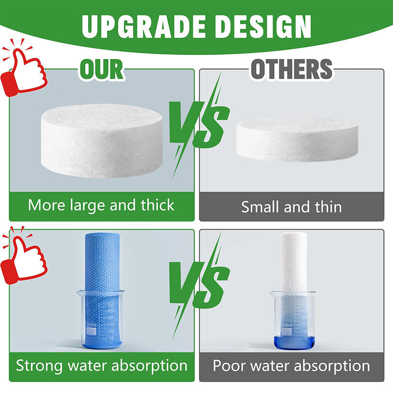 ✨Reticulation Process: Mini compressed towel tablets are using an anilox process, soft and long-lasting texture, strong water absorption, good breathability, strong decontamination, flexible and not easy to tear. Compared to traditional towels, it is cleaner, healthier.